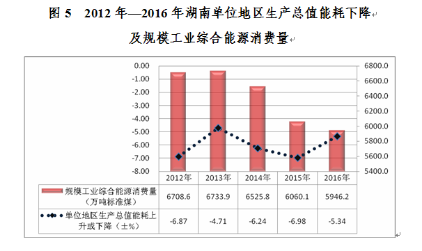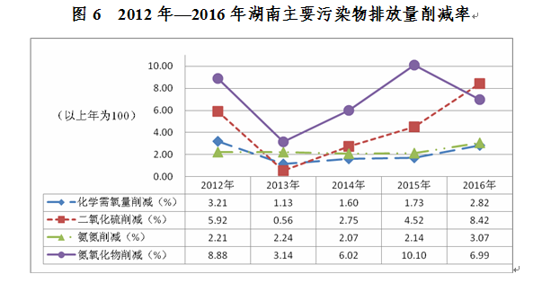 (三)新模式成效显现。在科技引领和新兴产业助力下,湖南经济发展的质量日益提高,能耗逐步下降,排污量逐年缩减,经济发展新模式提质减排成效显现。一是节能降耗稳步推进。十八大以来,湖南单位地区生产总值能耗持续下降,2013年至2016年,年均降幅达5.81%。规模工业综合能源消费量,由2012年的6708.6万吨标准煤,缩减为2016年的5946.2万吨标准煤(见图5)。二是防污减排成果显著。主要污染物排放量呈逐年削减态势。其中,化学需氧量、二氧化硫、氨氮和氮氧化物自2012年以来的五年间,年平均削减率分别为2.09%、4.40%、2.35%和7.00%(见图6)。