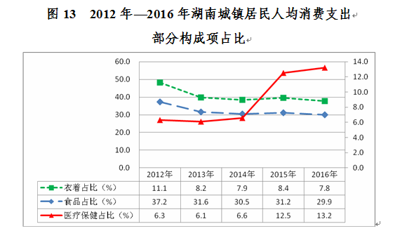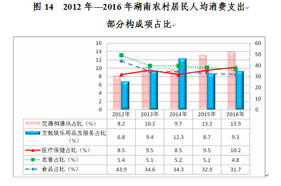 (一)消费内部结构呈现提质转变。十八大以来,全省城乡居民的消费结构悄然发生变化,人民群众为满足基本生活需要的支出比重逐步降低,而对提高生活品质的消费支出逐渐增加。这表明湖南城乡居民的消费需求层次不断提高,生活质量逐步改善。2016年,湖南城镇居民在食品和衣着方面的人均消费支出占总人均消费支出额的比重分别为29.9%和7.8%,分别比2012年降低了7.3个和3.3个百分点;而在医疗保健方面的支出比重则明显增加,由2012年的6.3%提高到2016年的13.2%,占比提高了6.9个百分点(见图13)。与此同时,省内农村居民的消费构成中,食品和衣着支出占比同样逐年下降,而除了医疗保健支出占比不断提升外,在交通和通讯,文教娱乐用品及服务两个方面的开支比例也明显提升。2016年,湖南农村居民在食品和衣着方面的支出占人均消费支出额的比重分别为31.7%和4.8%,分别比2012年降低了12.2个和0.6个百分点;用于医疗保健,交通和通讯,文教娱乐用品及服务三个方面的支出比例分别为10.2%、13.9%和9.3%,分别比2012年提高了1.7个、5.7个和2.5个百分点(见图14)。