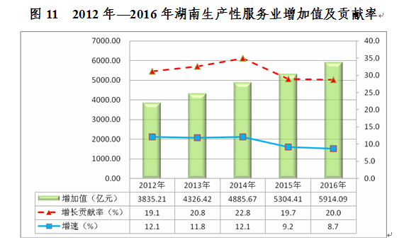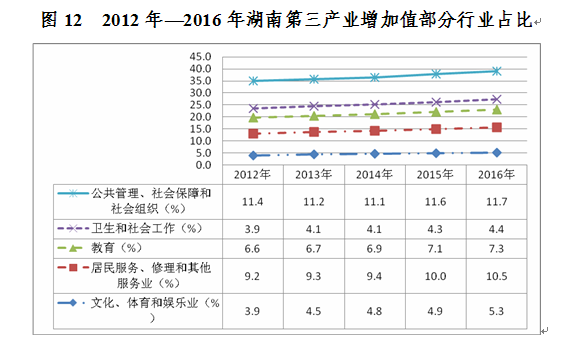 (三)第三产业内部结构档次提升。一是生产性服务业稳步发展。2016年,全省生产性服务业实现增加值5914.09亿元,是2012年的1.5倍;2013年至2016年,年平均增幅为10.4%,高于全省经济增长平均水平1.4个百分点。2012年至2016年,生产性服务业一直为全省经济增长提供了有力支撑,对经济增长贡献率始终维持在两成左右。2016年,生产性服务业拉动经济增长的贡献率为20.0%,比2012年提高了0.9个百分点(见图11)。二是与改善民生相关的服务行业快速发展。2016年,全省文化、体育和娱乐业实现增加值769.22亿元,是2012年的2.3倍;居民服务、修理和其他服务业实现增加值1530.49亿元,教育实现增加值1063.03亿元,卫生和社会工作实现增加值635.76亿元,均达到2012年的1.9倍;公共管理、社会保障和社会组织实现增加值1704.53亿元,是2012年的1.7倍。以上5个服务行业2016年增加值占当年第三产业增加值总量的比重,分别比2012年提高了1.4个、1.3个、0.7个、0.4个和0.3个百分点(见图12)。