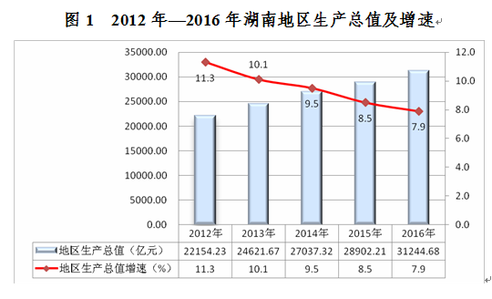十八大以来,湖南经济步入新常态。全省经济增速始终保持在平稳较快的发展区间,努力做到了调速不减势、量增质更优。2016年,湖南一二三产业增加值分别为3578.37亿元、13087.87亿元和14578.44亿元。2012年至2016年,湖南地区生产总值总量从22154.23亿元扩大到31244.68亿元,五年间增额接近万亿;2013年至2016年,年平均增速为9.0%(见图1)。