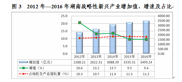 (二)新产业蓬勃发展。十八大以来,在省委、省政府一系列加快培育发展战略性新兴产业的方针政策下,湖南战略性新兴产业、高新技术产业等新产业蓬勃发展。一是战略性新兴产业平稳较快发展。2016年,全省战略性新兴产业增加值达3499.24亿元,是2012年的1.5倍,占地区生产总值的比重为11.2%,比2012年的10.3%提高了0.9个百分点。2013年至2016年,年均增长11.4%,比全省经济增长平均水平高2.4个百分点(见图3)。二是高新技术产业发展动力强劲。近年来,湖南以高新技术创新及实际运用为抓手,大力发展科技生产力。2016年,全省高新技术产业增加值达6859.20亿元,与2012年相比实现翻番;2013年至2016年,年均增速达19.0%。高新技术产业增加值占全省地区生产总值的比重也逐年攀升,2016年达22.0%,比2012年的15.0%提高了7.0个百分点(见图4)。与此同时,高新技术产品出口占全省出口额的比重也逐年提高,2016年占比达14.6%,比2012年提高了3.6个百分点,从另一个侧面展现出湖南高新技术产业产销两旺的良好局面。