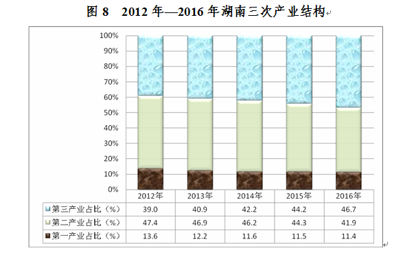 (一)三次产业结构演变趋势向好。三次产业结构由2012年的13.6:47.4:39.0,演变为2016年的11.4:41.9:46.7。其中,一、二产业增加值占全省地区生产总值的比重呈逐年下降趋势。第一产业占比降低了2.2个百分点,第二产业占比降低了5.5个百分点。三产业占比则逐年提高,且占比呈逐年显著加大趋势,提升了7.7个百分点(见图8)。根据产业结构由低级向高级演进的普遍规律,地区产业结构演进由低到高可大致分为三个类型,即第一产业为主的金字塔型产业结构,第二产业为主的鼓型产业结构,及以第三产业为主的倒金字塔型产业结构。近五年相关数据表明,湖南产业结构目前已处于第二演进类型的中后期,而且逐步向更高层级的第三产业结构类型演进。