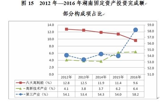 (二)投资内部结构调整成效显现。一是投资重心逐步向第三产业倾斜。2016年,湖南第三产业固定资产投资完成额16119.86亿元,是2012年的2倍。近五年来,第三产业固定资产投资完成额占全省总额的比重逐年提高,2016年该占比达58.2%,比2012年占比提高了4.1个百分点。二是高新技术产业投资较快增长。2016年,湖南高新技术产业投资完成额1774.40亿元,是2012年的近3倍。五年中,高新技术产业投资完成额占全省总额的比重不断提高,由2012年的4.1%上升到2016年的6.4%,提高了2.3个百分点。三是六大高耗能行业投资占比逐年减少。湖南六大高耗能行业固定资产投资完成额占全省总额的比重由2012年的12.8%下降到2016年的9.6%,降低了3.2个百分点(见图15)。