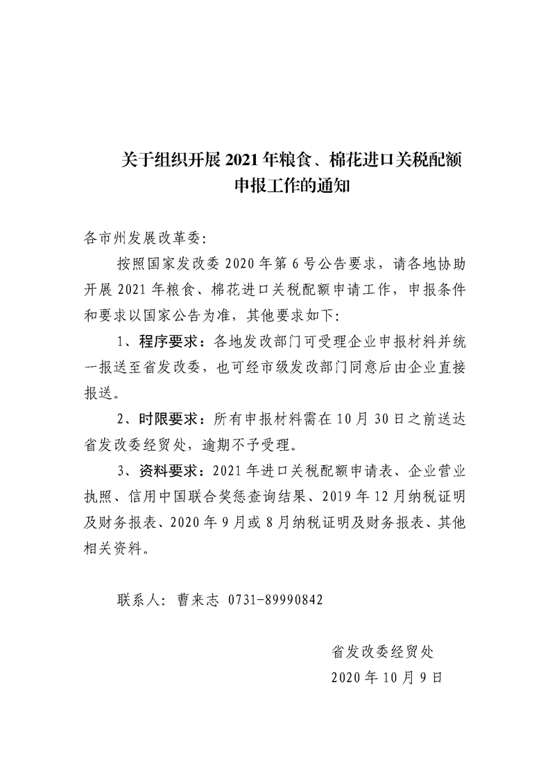 湖南省发展改革委关于组织开展2021年粮食、棉花进口关税配额申报工作的通知