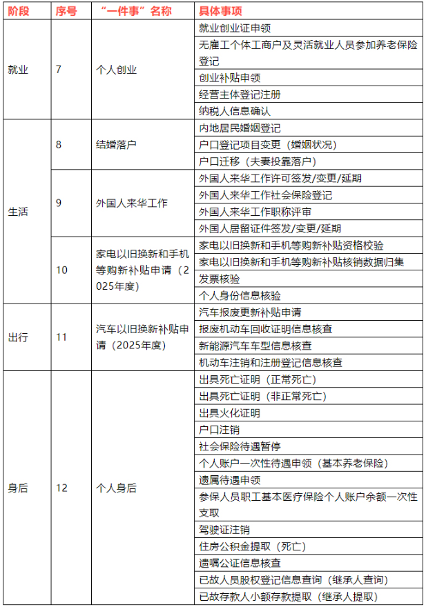 《清单》中包含固定资产投资项目审批、新车上牌等企业事项和结婚落户、家电以旧换新和手机等购新补贴申请(2025年度)、汽车以旧换新补贴申请(2025年度)等个人事项。