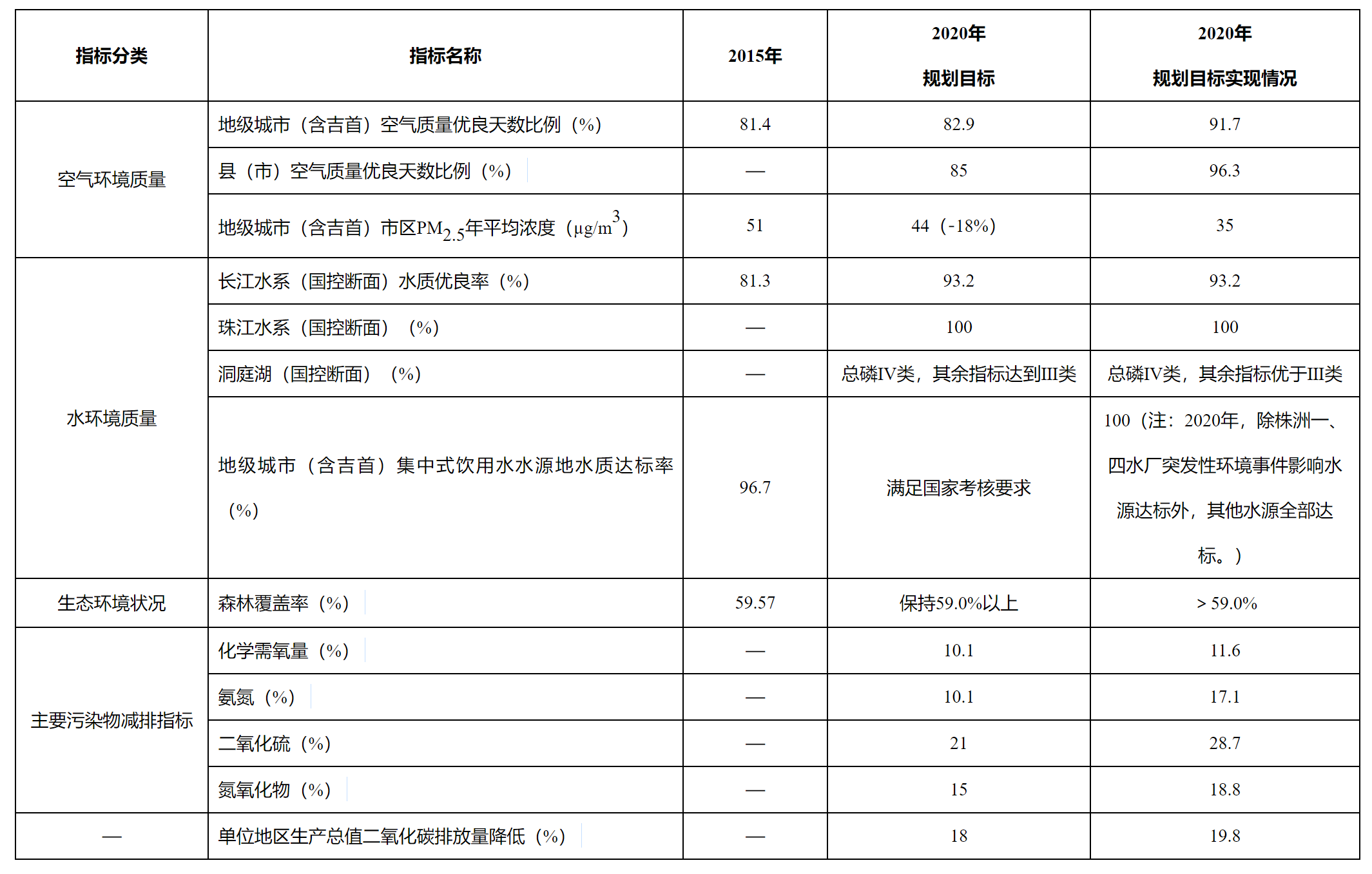 生态环境质量改善更加明显。2020年,全省60个国家考核断面水质优良率为93.3%,国考断面全面消除劣Ⅴ类水质,长江干流湖南段和湘资沅澧干流全面达到或优于Ⅱ类水质,洞庭湖总磷浓度下降到0.06毫克/升,较2015年下降46.4%。全省地级城市空气质量优良天数比例为91.7%,比2015年提高10.3个百分点,全省PM2.5年均浓度为35微克/立方,达到国家环境空气质量二级标准的市级城市由2015年的0个提升至7个。全省受污染耕地和污染地块安全利用率达到国家考核要求,完成全省农用地土壤污染状况详查,排查整治428家涉镉重金属重点行业企业,土壤环境安全可控。