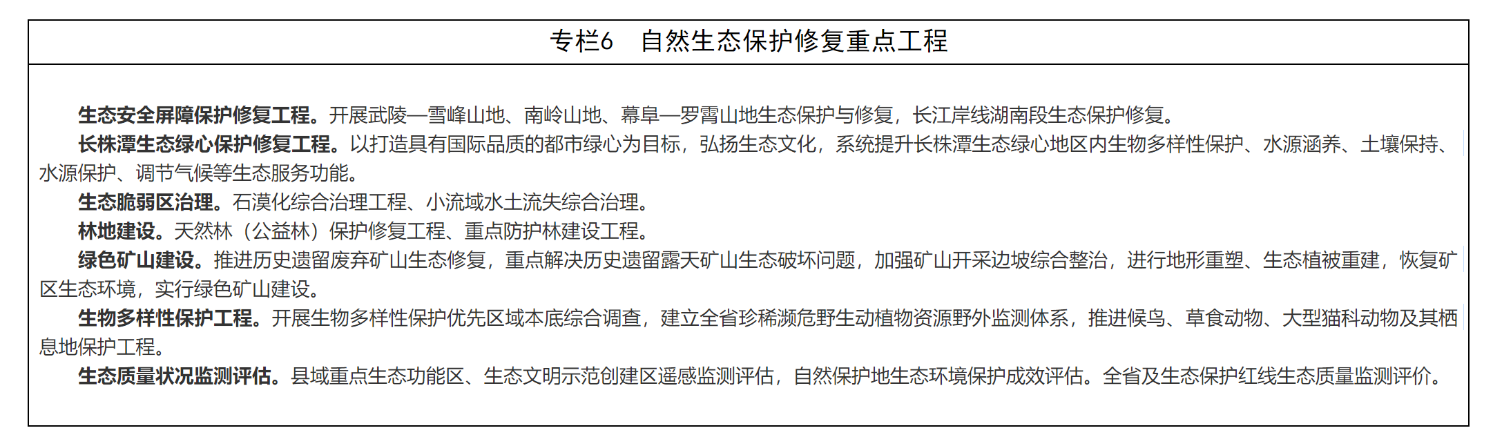 筑牢生态安全屏障。加强“一江一湖三山四水”重要生态功能区域保护,统筹推进山水林田湖草沙系统保护修复。保障长江岸线、洞庭湖区域洪水调蓄、水源涵养、气候调节和生物多样性保护等生态功能,推动长江及其岸线生态恢复、洞庭湖及其内湖湿地生态系统修复,打造长江绿色生态廊道,改善江湖连通性,提升生态系统稳定性和生态服务功能,保护江豚、候鸟等珍稀濒危和区域代表性野生动植物栖息地及迁徙路线。发挥武陵—雪峰山区、南岭山区、罗霄—幕阜山区和湘资沅澧四水源头生物多样性维护、水源涵养、水土保持生态功能,加强原生地带性植被保护和珍稀原生动植物保护,加快区域生态廊道建设,加强湘资沅澧四水上游及两岸天然林保护、公益林建设和造林绿化。
