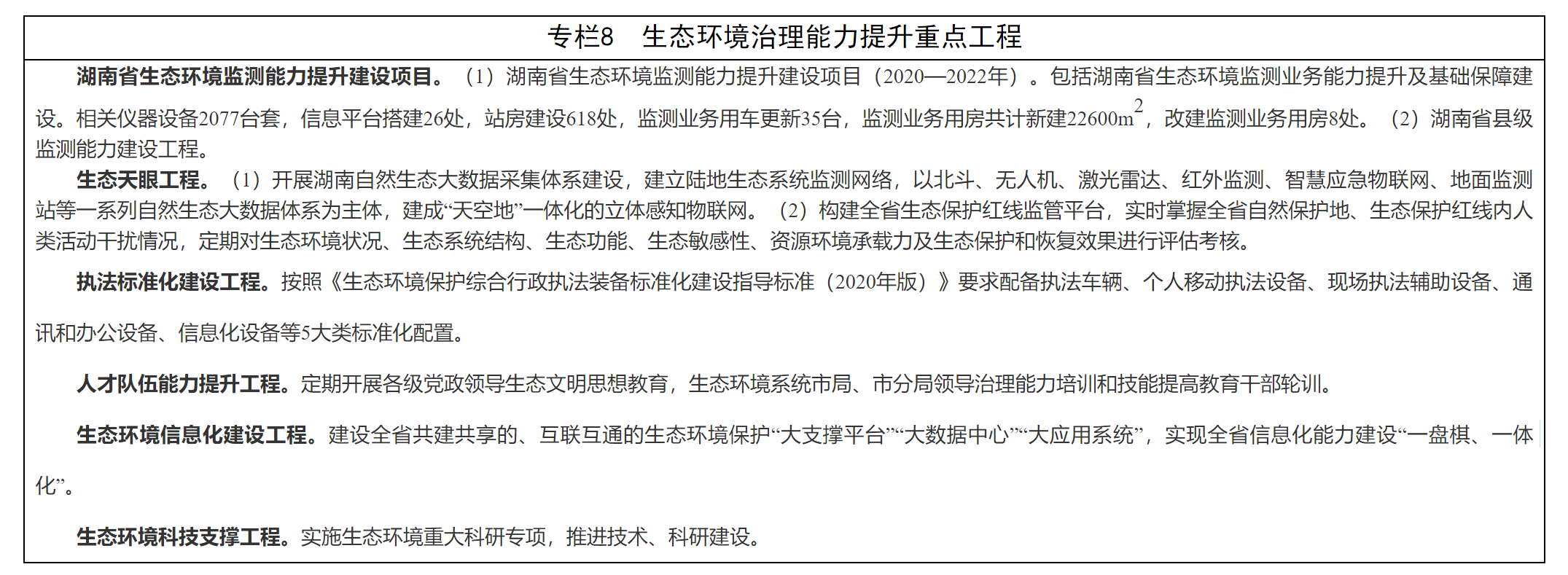 谋划储备重点项目。以八个方向重点工程为引领,根据每个方向重点任务类别,细化项目组成,建立《湖南省“十四五”生态环境保护重点项目储备库》(以下简称项目储备库),推进规划实施项目化。