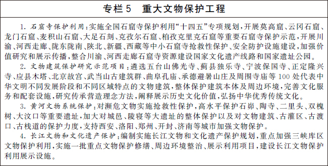 实施重要木结构文物建筑保护修缮工程。加强长城、大运河、丝绸之路以及中东铁路等线性文化遗产重要点段保护修缮。实施全国重点文物保护单位、省级文物保护单位密集区域保护提升工程,整体保护文物本体和改善周边环境。实施黄河文物系统保护,加强长江文物和文化遗产保护,推进首都功能核心区、三峡库区文物保护利用。加强石窟寺保护管理,健全国家和区域两级石窟寺保护研究协调机制。