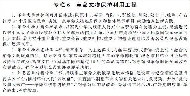 整合文物、党史、军史、档案、地方志等方面研究力量,加强革命文物保护利用研究,开展实物、文献、档案、史料和口述史征集,挖掘革命文物深刻内涵,推出重要研究成果,旗帜鲜明反对和抵制历史虚无主义,继续发扬伟大建党精神,传承弘扬井冈山精神、长征精神、遵义会议精神、延安精神、西柏坡精神、红岩精神、抗美援朝精神、“两弹一星”精神、特区精神、抗洪精神、抗震救灾精神、抗疫精神、脱贫攻坚精神等伟大精神。