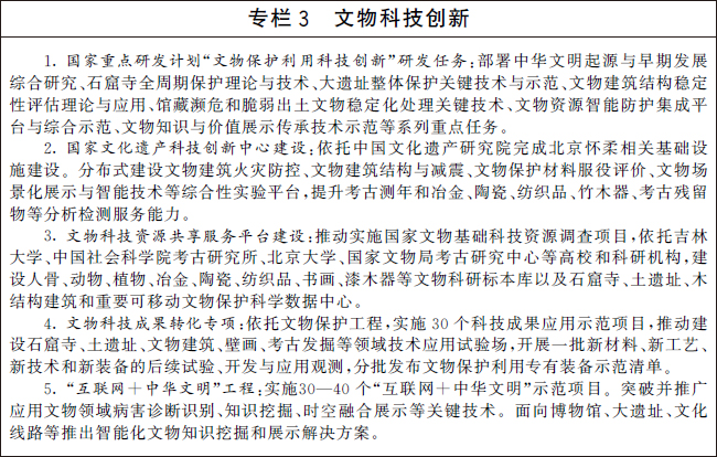 面向文物防、保、研、管、用等五大需求领域,在国家重点研发计划中部署“文物保护利用科技创新”等研发任务,突破一批关键材料、工艺、装备和集成技术。大力发展文物灾害风险防控、火灾防范与应急处置专用技术体系;重点突破石窟寺、土遗址和木结构建筑等文物病害探测、原位诊断、防治和保护工程质量评价关键技术,优化系统解决方案;加快攻克饱水象牙、贝叶经、粉化甲骨、简牍等抢救性保护技术难题;持续推动考古探测、残留物检测、工艺鉴别、产地溯源等技术升级,增强考古发现提取与综合分析能力;研究文物资源保护规划关键技术,推进文物资源管理智能化;研究构建文物知识图谱,开展文物展示传播技术创新应用示范。