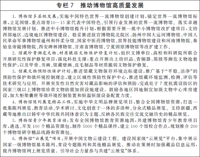 实施中国特色世界一流博物馆创建计划。支持省级、重要地市级博物馆特色化发展。盘活基层博物馆资源。探索建立行业博物馆联合认证、共建共管机制。规范和扶持非国有博物馆发展,落实支持政策,依法依规推进非国有博物馆法人财产权确权。认真履行相关审批程序,有序推动建设一批反映党和国家建设成就的当代主题博物馆和行业博物馆,重点支持建设反映中华文明发展历程的国家级重点专题博物馆,倡导建设特色专题博物馆。探索在文化资源丰厚地区建设“博物馆之城”。