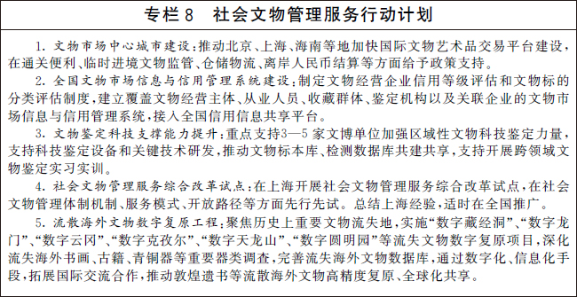 营造健康的文物市场环境,培育现代文物市场体系,优化文物市场区域布局。强化文物商店作用,探索降低文物商店准营门槛,推动国有文物商店改革。培育一批具有市场美誉度和国际影响力的文物拍卖龙头企业,扶持中小文物经营主体。支持发展现代经营方式,推动文物市场线上线下融合,支持在线展示、交易和定制服务等新业态发展。完善民间收藏文物登记交易制度,建设全国文物市场信息与信用管理系统,完善文物流通信用体系、文物市场全流程协同监管机制。