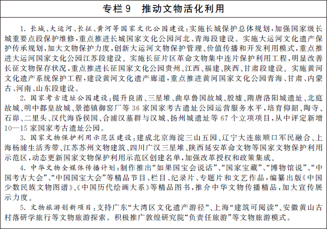 创新文物保护利用机制,加强文物和文化遗产保护利用,建设国家文物保护利用示范区。健全国有文物资源资产管理制度,推进文物资源资产管理信息共享,部署开展相关试点工作。完善各方主体参与文物保护利用的支持政策,保障利益相关方合法权益。探索创新对文物资源密集区的支持方式。建设文物领域国家智库。