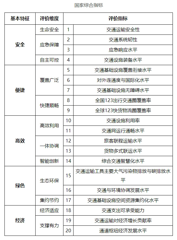 综合考虑各地区、各行业特点,注重交通运输与经济社会、生态环境相协调,统筹发展和安全,围绕“安全、便捷、高效、绿色、经济”,从“基本特征、评价维度、评价指标”三级设置20项评价指标。相应设置部分表征指标,供行业、地方制定指标参考,具体见附件。