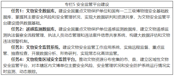 完善文物安全监管平台建设规范,推动文物资源大省和有条件的省份建成文物安全监管平台。支持文物资源密集地区集中建设区域性文物安全监管平台,实现辖区内博物馆和安全风险突出的文物保护单位安全监管全覆盖,推动文物资源纳入公共安全视频建设联网应用工作。