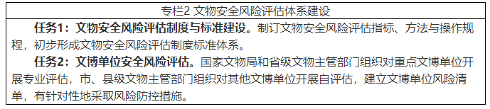 建立安全风险评估体系。加强文物安全风险评估与控制、基础理论与实践方法研究,探索建立适合文物安全风险评估的制度方法,制订文物安全风险评估标准与操作规程,形成较为完善的文物安全风险评估体系。