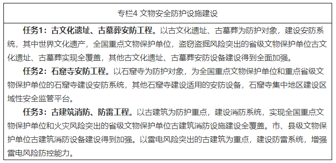 加大文物安全投入,加强财政预算与规划实施的协调衔接,完善文物安全经费落实保障机制,国家文物保护专项资金和省级文物保护经费中,要保障文物安防、消防和防雷等保护性设施建设经费,强化文物安全基础,增强防护能力。