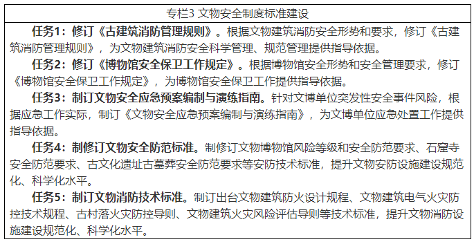 健全文物安全技术标准。针对文博单位安全防护需求,制订完善文物安防、消防和防雷技术标准。根据古文化遗址、古墓葬、石窟寺安防和古建筑、传统村落消防等安全防范需求,制订专项技术标准。出台文物安全监管平台建设技术指导标准,实现文物安全防护智能化和标准化。