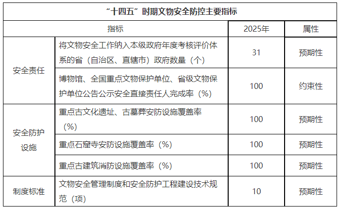 到2025年,文物安全工作纳入省级人民政府年度考核评价体系,部门监管高效有力,博物馆和文物管理使用单位直接责任持续强化,文物安全责任体系更加完善。文物安全风险评估体系基本形成,文物安全防护工程有序实施,博物馆、重点古文化遗址、古墓葬、石窟寺和古建筑安全防护设施建设全覆盖,文博单位安全防护基础更加牢固。文物资源大省和文物资源密集地区推进文物安全监管平台建设,新技术应用更加广泛,文物安全预警防控系统更加高效。安全管理制度和防范技术标准更加完善,文物安全隐患整治取得实效,文物防灾减灾和应急管理能力显著增强,文博单位安全管理水平明显提升,文物安全形势明显好转,为推动文物事业高质量发展奠定坚实基础。
