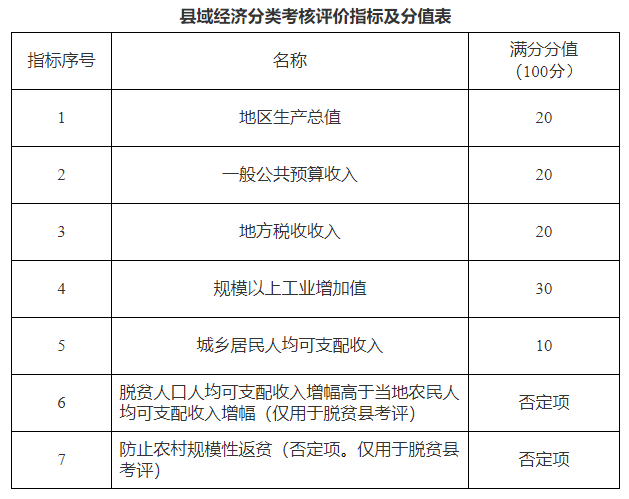 (一)指标体系。将各县当期地区生产总值、一般公共预算收入、地方税收收入、规模以上工业增加值、城乡居民人均可支配收入等5项指标的总量和增幅作为考评指标。设置地区生产总值和一般公共预算收入增幅不低于全省平均水平的否定项。综合考虑脱贫县经济发展实际,对47个脱贫县增加脱贫人口人均可支配收入增幅高于当地农民人均可支配收入增幅、防止农村规模性返贫2个否定项。
