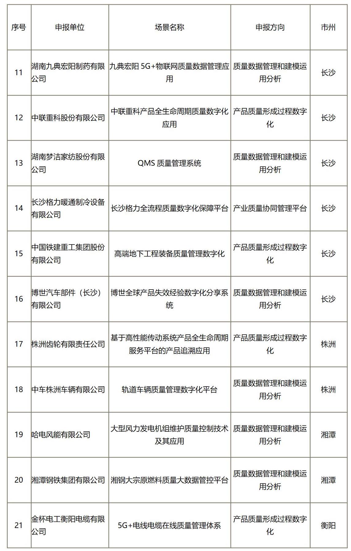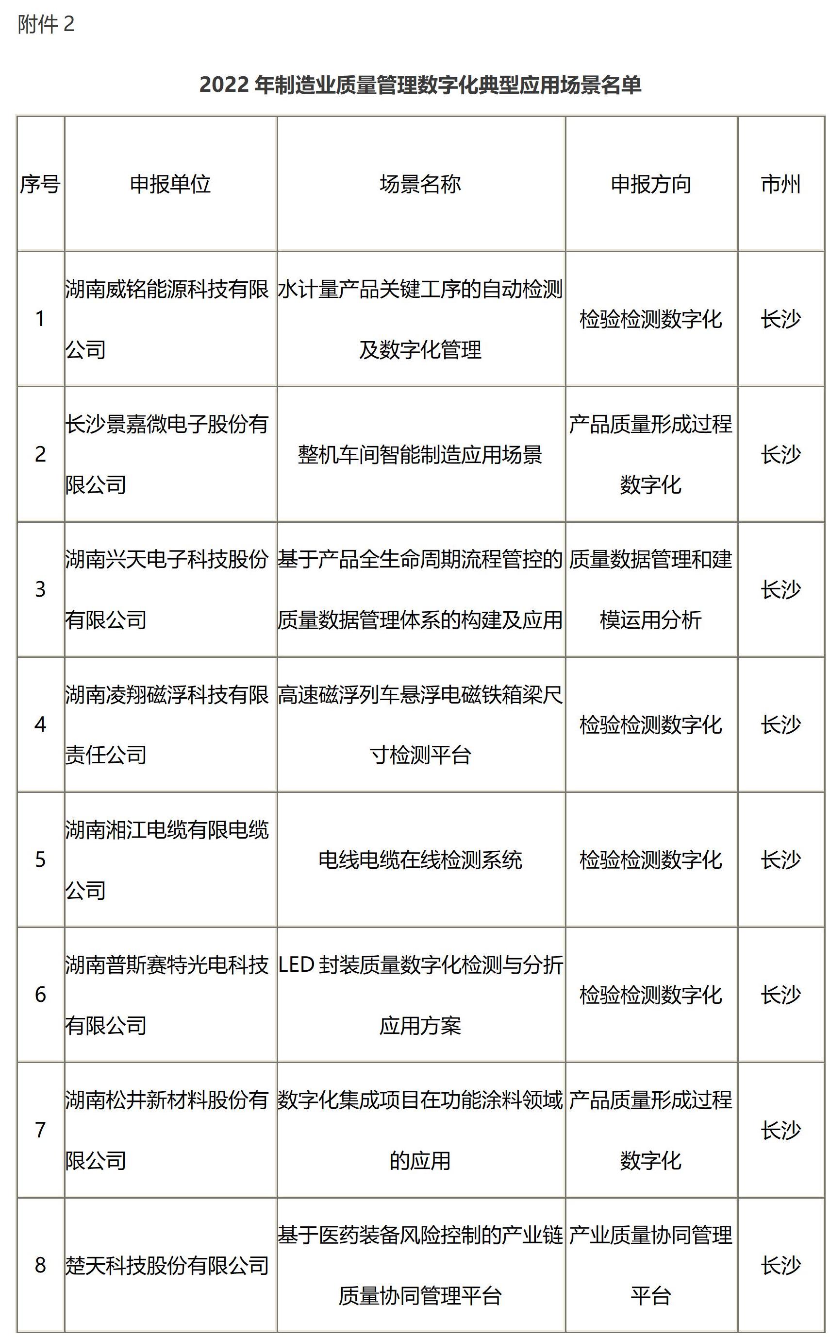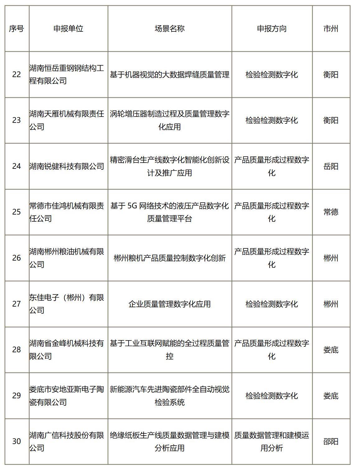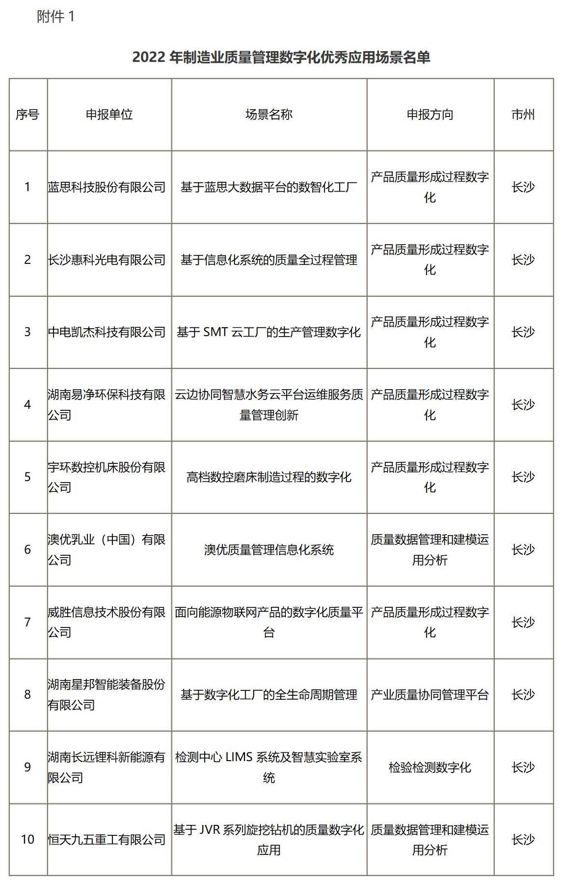 为全面落实“三高四新”战略定位和使命任务,加快建设国家重要先进制造业高地,引导制造业企业深入应用新一代信息技术加快质量管理创新,提升制造业产品和服务质量水平,按照《关于以数字化推进制造业质量管理创新的实施方案》(湘工信科技〔2022〕189号)要求,经企业申报、市州推荐、专家评审等环节,遴选出2022年全省制造业30个质量管理数字化优秀应用场景和60个质量管理数字化典型应用场景,现予发布。
