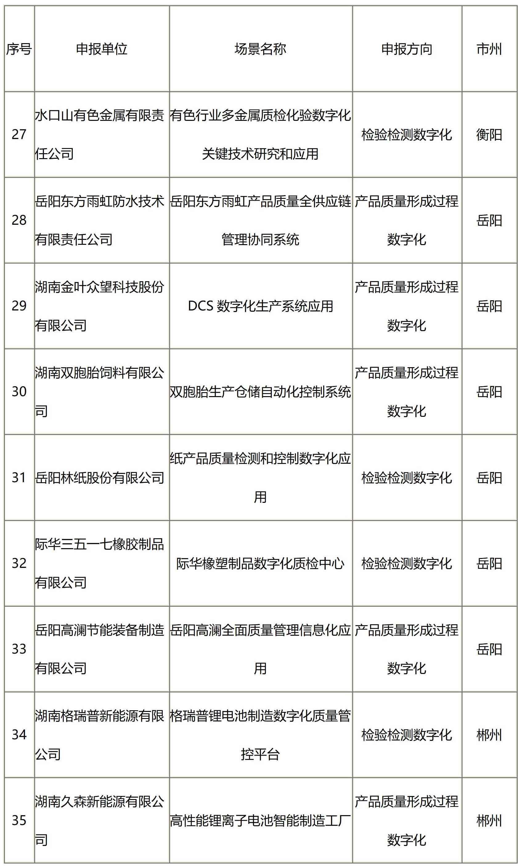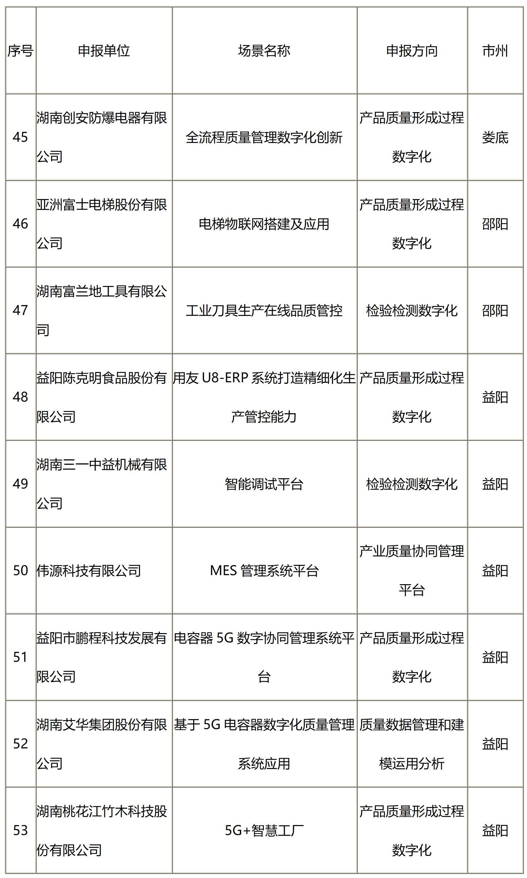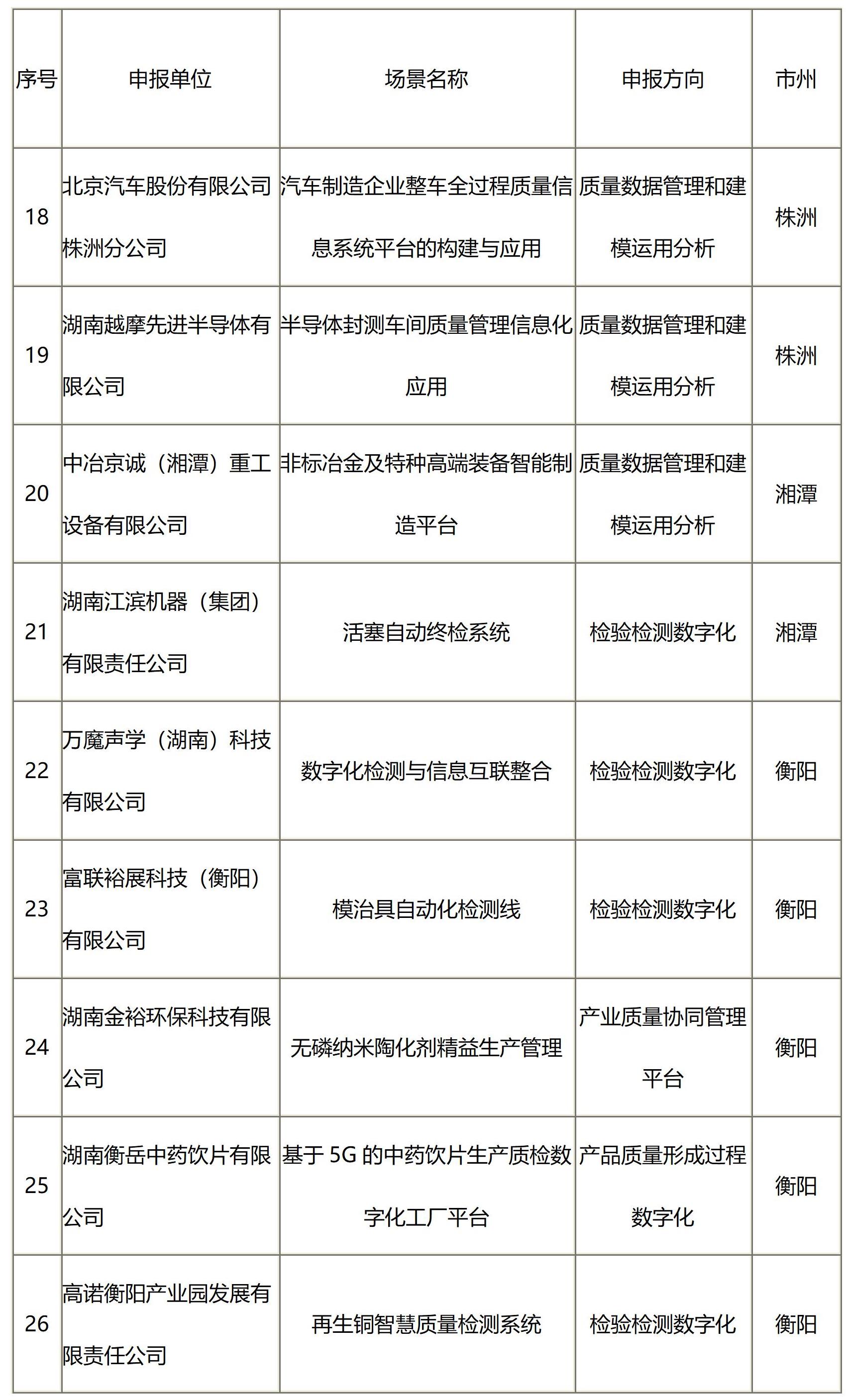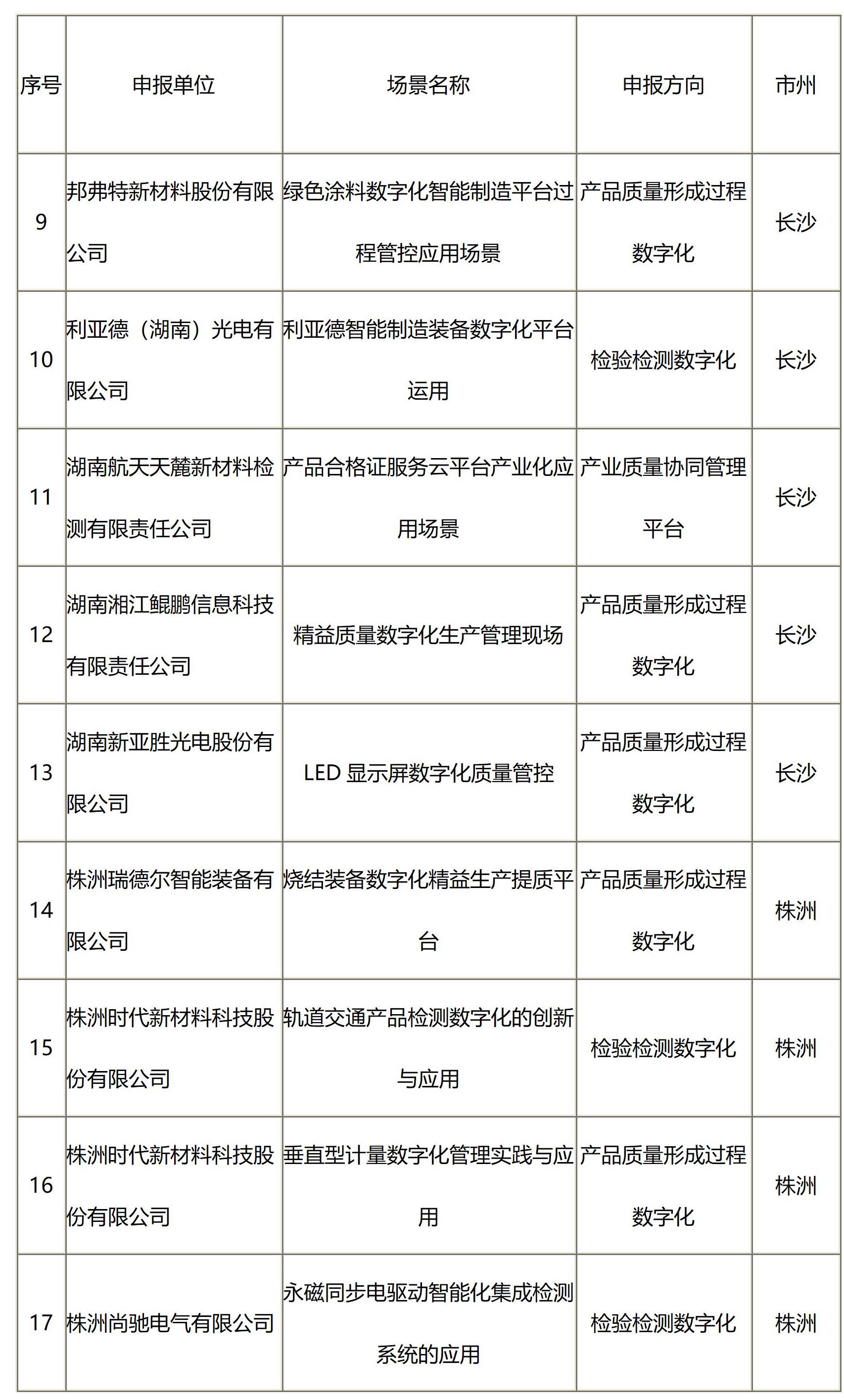 为全面落实“三高四新”战略定位和使命任务,加快建设国家重要先进制造业高地,引导制造业企业深入应用新一代信息技术加快质量管理创新,提升制造业产品和服务质量水平,按照《关于以数字化推进制造业质量管理创新的实施方案》(湘工信科技〔2022〕189号)要求,经企业申报、市州推荐、专家评审等环节,遴选出2022年全省制造业30个质量管理数字化优秀应用场景和60个质量管理数字化典型应用场景,现予发布。