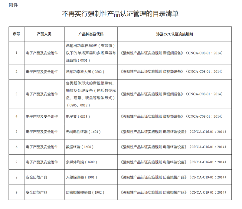 一、对安全风险较低、技术较为成熟的9种电子电器产品不再实行CCC认证管理(见附件)。