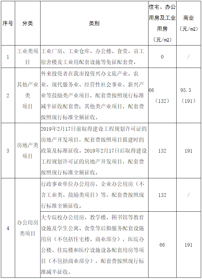 外来投资者在我市投资兴办文旅产业、农业、现代服务业、经营性社会事业、新兴产业等鼓励类产业项目,配套费按照现行标准减半征收;其他类产业项目,配套费按照现行标准全额征收。