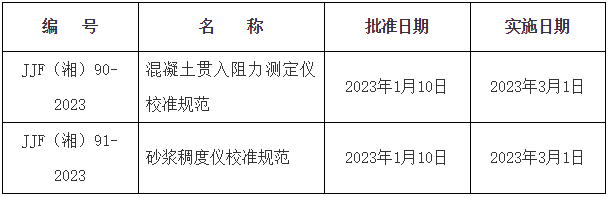 根据《中华人民共和国计量法》有关规定,现批准《混凝土贯入阻力测定仪校准规范》《砂浆稠度仪校准规范》等2项湖南省地方计量技术规范发布实施。