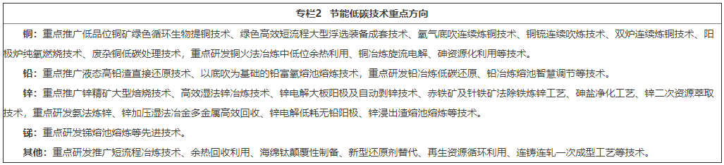 “十四五”期间,有色金属行业产业结构、能源消费结构明显优化,低碳工艺推广应用取得重要进展,再生金属供应占比进一步提高,铅、锌、铜等重点产品单位产品能耗及碳排放强度进一步降低。到2025年,再生金属供应占比达到24%以上,全行业规模以上工业单位增加值能耗较2020年下降14%,规模以上工业单位增加值二氧化碳排放下降率完成国家下达目标,铅、锌、铜冶炼能效标杆水平以上产能比例达到50%。