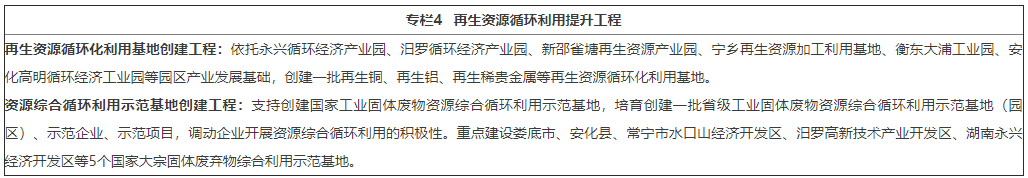 9.推进再生资源循环化利用。大力发展有色金属再生资源利用产业,完善废弃有色金属资源回收、分选和加工网络体系,鼓励郴州、岳阳、衡阳等再生有色金属产业发展基础较好的地区建设资源综合回收利用基地,建设有色金属再生资源综合回收利用产业园和交易中心,布局区域回收预处理配送中心,规范发展废旧有色金属回收,探索创建以再生资源为主、原生资源为辅的资源循环供应体系。(省发展改革委、省工业和信息化厅、省生态环境厅、省商务厅按职责分工负责)