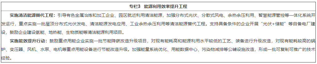 8.提升节能降碳水平。实施重点用能设备系统节能改造,积极发展使用先进高效产品设备。鼓励有色金属冶炼和压延加工企业对标行业标杆水平或国际先进水平,制定“一企一策”节能降碳改造升级方案,深挖节能降碳潜力,打造行业能效“领跑者”。通过市场调节机制,推动能源要素向优质项目、优质企业集聚。持续开展工业节能监察专项督查,强化重点用能单位节能管理和目标责任,规范企业用能行为。(省发展改革委、省工业和信息化厅按职责分工负责)