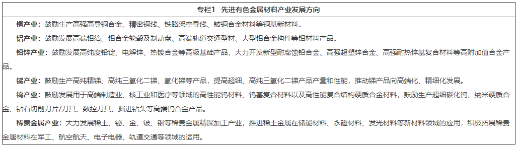 2.大力发展先进有色金属材料产业。推进有色金属材料产业链补链、强链、延链,强化有色金属产品在“3+3+2”产业集群体系建设中的应用,大力发展铜、铝、铅、锌、锑、钨、稀土、铋、金、铍、铟等有色金属精深加工产业,不断壮大硬质合金材料、铜基材料、铝基材料、铅锌基材料、高纯锑材料、钛及钛合金材料、稀贵金属材料、稀土材料等细分行业。支持有色金属行业与石化化工、钢铁、建材等行业耦合发展,着力打造先进有色金属材料产业集群,带动整个行业绿色低碳发展。(省工业和信息化厅、省发展改革委按职责分工负责)