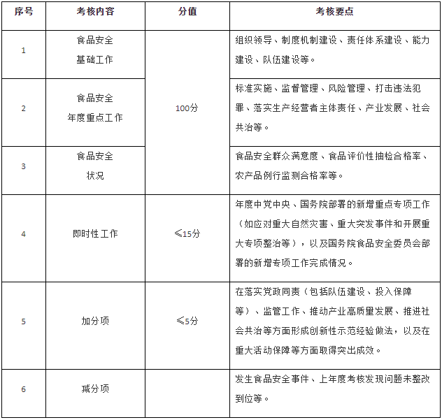 第五条 考核内容主要包括食品安全基础工作推进、年度重点工作落实、食品安全状况等,同时设置即时性工作评价和加减分项(考核内容要点见附件)。具体考核指标及分值在年度食品安全工作考核方案及其细则中明确,设置要科学合理,可操作、可评价、可区分,切实减轻基层负担。