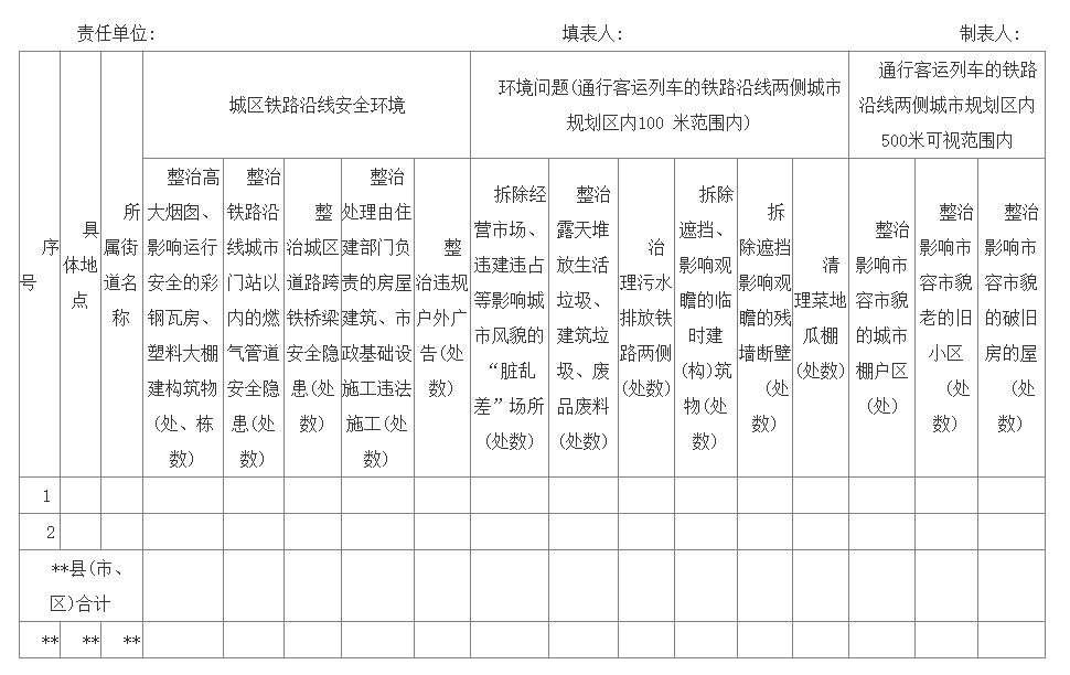 (五)加强工作调度,做好信息报送。铁路沿线环境综合整治建立季度信息调度制度。各市州住房城乡建设、城市管理和综合执法部门要明确专人(负责人部门名称、姓名、联系方式于7月15日前报省厅城市管理和执法监督局汇总)负责信息调度,铁路环境整治台账底数清单(见附件1)于7月底前报省厅,整治提升台账及工作进展情况(铁路环境安全隐患、环境问题摸底排查情况、治理情况,取得的成效、主要做法及工作建议)于每季度末25日前报送至省厅统一邮箱,省厅相关处室负责督促落实。