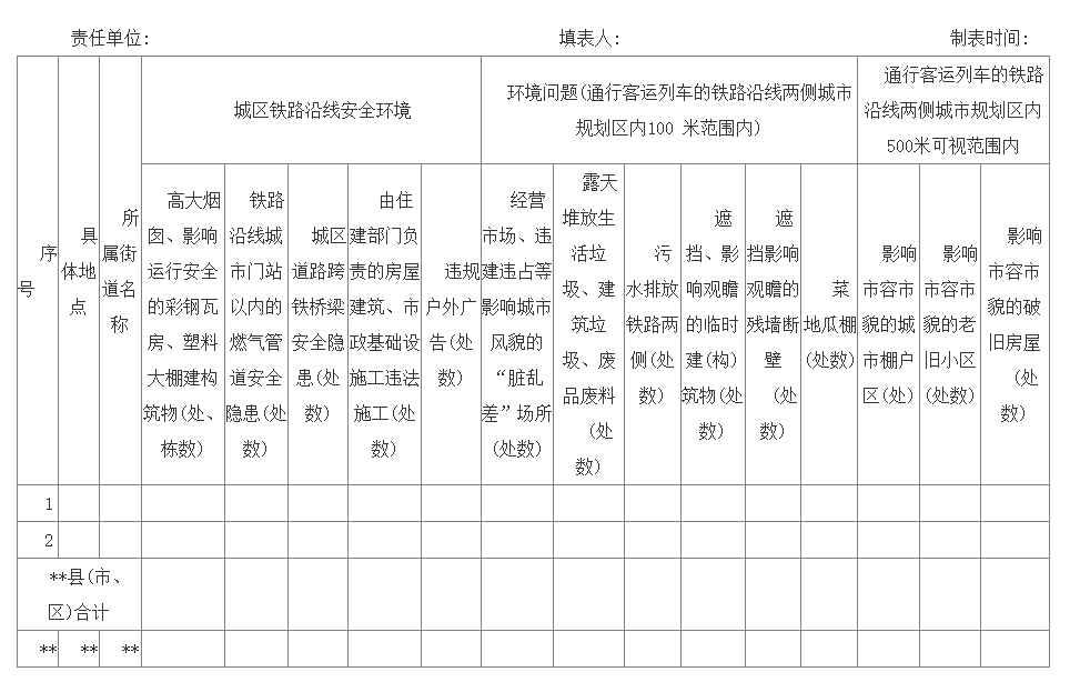 2.排查摸底阶段(2023年6月-7月)。各市、县住房城乡建设、城市管理和综合执法部门要配合铁路运输企业对铁路沿线环境问题开展全面摸底排查,摸清辖区铁路环境安全隐患、环境问题并建立台账清单(见附件1)。