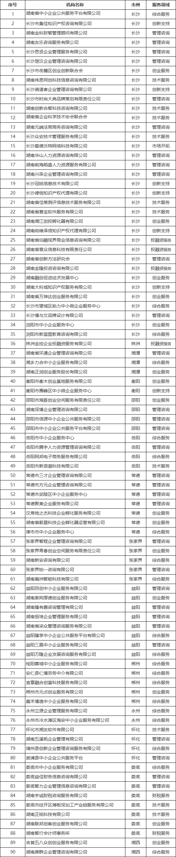 根据《关于征集2023年“创客中国”湖南省中小微企业创新创业大赛项目服务机构的通知》要求,在服务机构自主报名基础上,经审定,遴选出湖南省中小企业公共服务平台公司等90家单位为2023年“创客中国”湖南省中小微企业创新创业大赛推荐服务机构,现将名单予以公布。