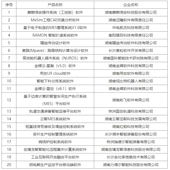 为贯彻落实《湖南省“智赋万企”行动方案(2023-2025年)》、《湖南省软件产业振兴计划(2021-2025年)》,提升我省工业软件技术创新和供给能力,根据省工信厅《关于征集2023年湖南省工业软件优秀产品的通知》要求,经企业自主申报、专家评审、公示等程序,遴选出湖南麒麟信安科技股份有限公司“麒麟信安操作系统(工控版)软件”等20个产品为2023年湖南省工业软件优秀产品,现予公布。