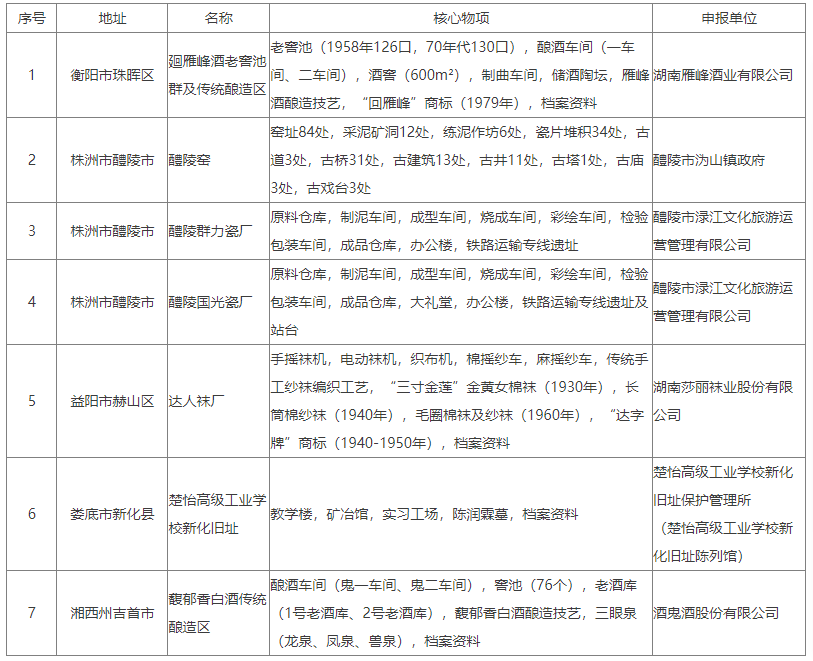 根据《湖南省工业遗产管理办法》(湘工信产业〔2023〕111号)和《湖南省工业和信息化厅关于开展第一批湖南省工业遗产认定申报工作的通知》(湘工信产业〔2023〕138号),经工业遗产所有权人自愿申请、相关市州工信局推荐、专家评审、现场核查、厅党组会研究和网上公示等程序,确定了第一批湖南省工业遗产名单,现予以公布。