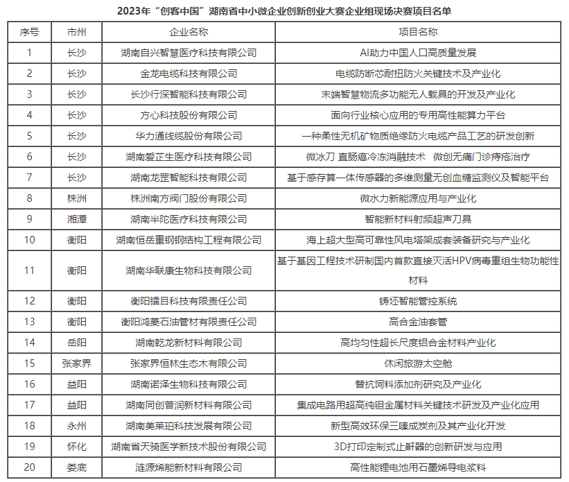 2.2023年“创客中国”湖南省中小微企业创新创业大赛企业组现场决赛项目名单