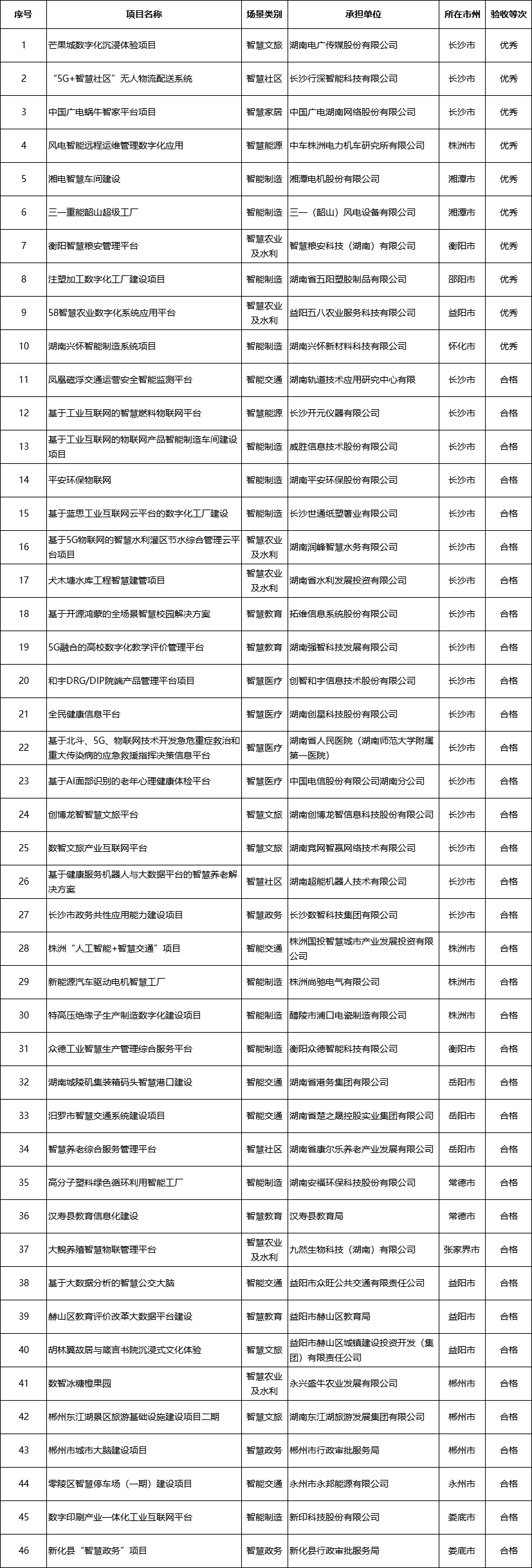 为贯彻落实2023年省政府工作报告“打造数字湖南十大应用场景”及《2023年数字湖南建设工作要点》工作部署,省工信厅组织对2023年数字湖南十大应用场景建设计划重点项目进行了验收。经项目单位申报、省直有关单位及市州工信部门初审推荐、答辩评审等程序,46个项目通过验收,确定为“2023年数字湖南十大应用场景建设示范项目”,其中,湖南电广传媒股份有限公司“芒果城数字化沉浸体验项目”等10个项目为优秀等次。现予发布。