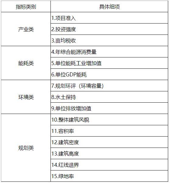 1.固定资产投资强度、亩均税收指标、能耗控制指标、污染物排放控制指标及其它相关指标;