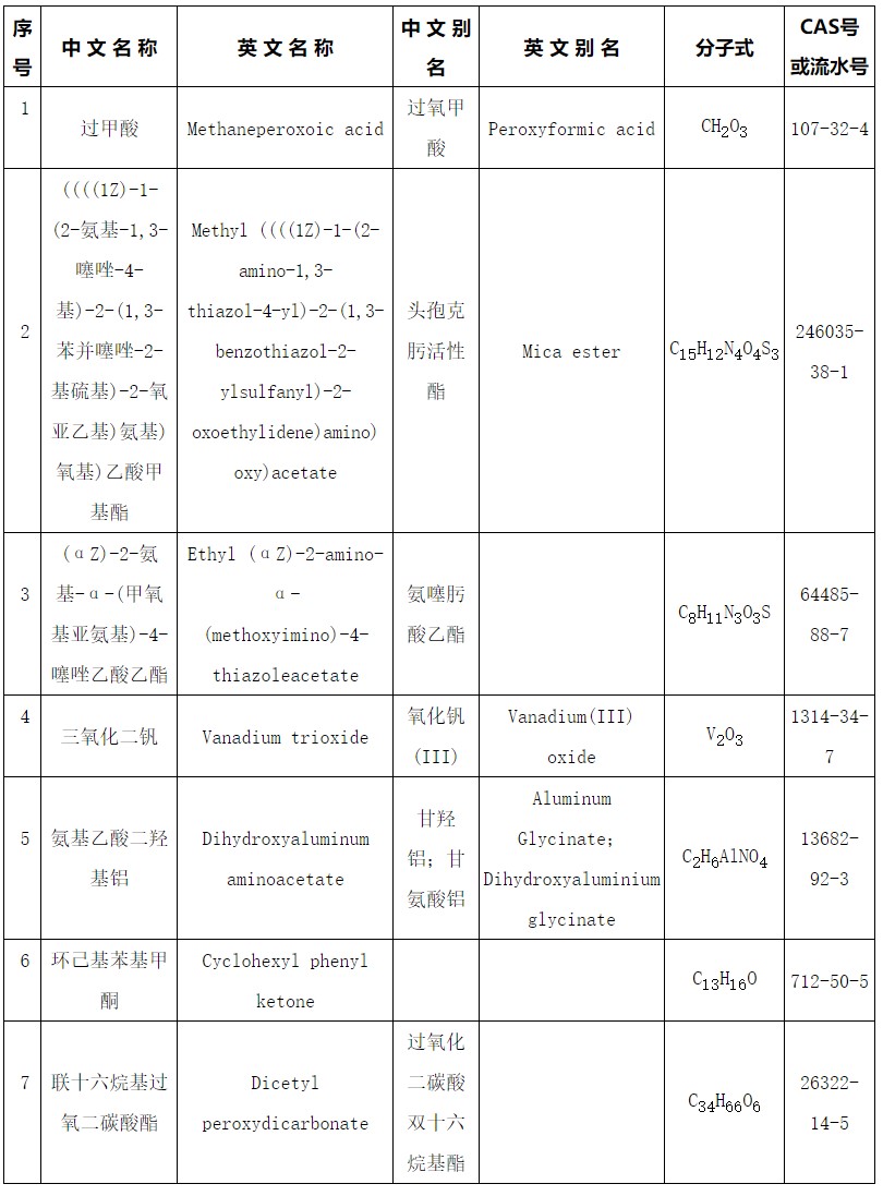 列入《中国现有化学物质名录》的7种符合增补要求的化学物质