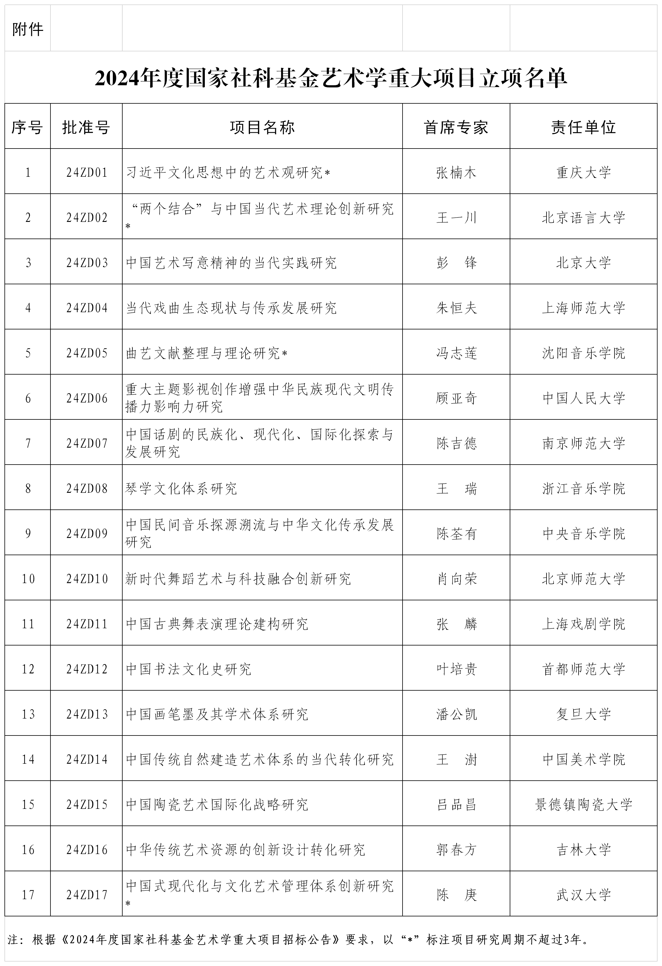 经公示及报批,现将2024年度国家社科基金艺术学重大项目立项名单予以公布,共17项。