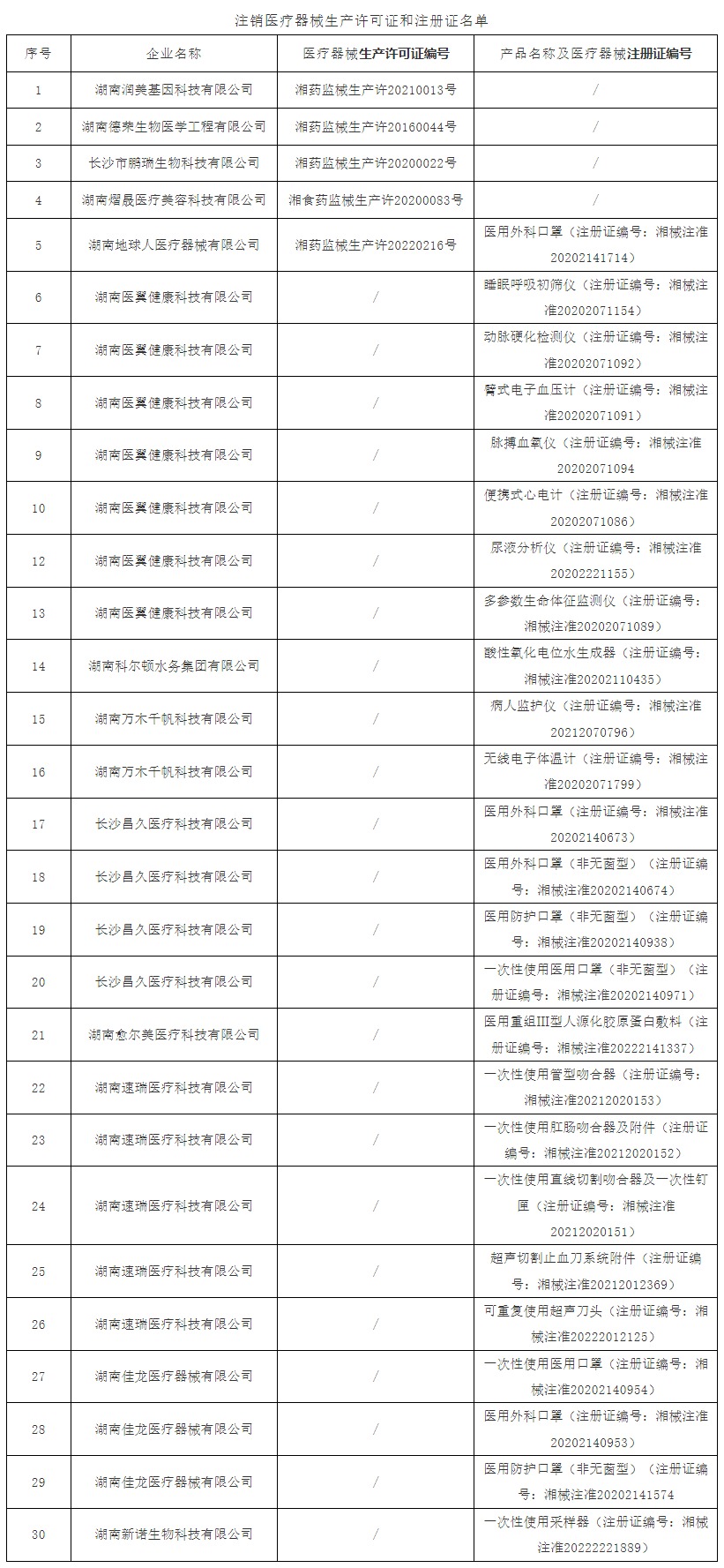 按照《医疗器械生产监督管理办法》《医疗器械注册与备案管理办法》有关规定,根据企业申请,现注销湖南润美基因科技有限公司等5家企业的医疗器械生产许可证;注销湖南医翼健康科技有限公司等8家企业的25个产品的医疗器械注册证。(名单详见附件)