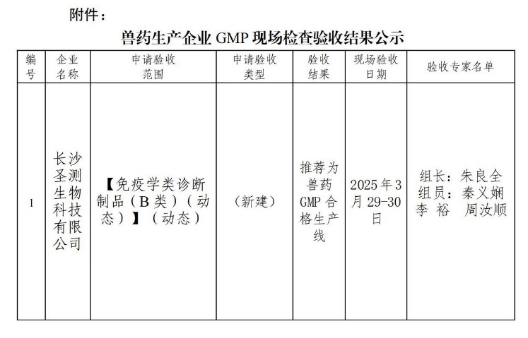 根据《兽医诊断制品生产质量管理规范》《兽药生产质量管理规范(2020年修订)》的规定,依照《兽药生产质量管理规范检查验收办法》《兽医诊断制品生产质量管理规范检查验收评定标准》,我办派出专家组对长沙圣测生物科技有限公司GMP实施情况进行现场检查验收。现将检查验收结果予以公示(见附件),公示期为2025年4月21日~25日,如有不同意见,请向我办反映。