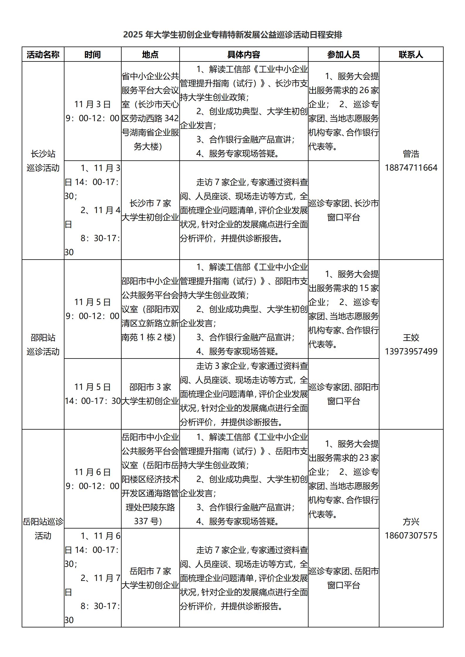 为贯彻落实《湖南省大学生初创企业服务指引》,推动“一起益企”之“送解优”大学生初创企业服务周成果落地见效,精准服务大学生初创企业,决定开展2025年大学生初创企业专精特新发展公益巡诊活动,现将相关事项通知如下: