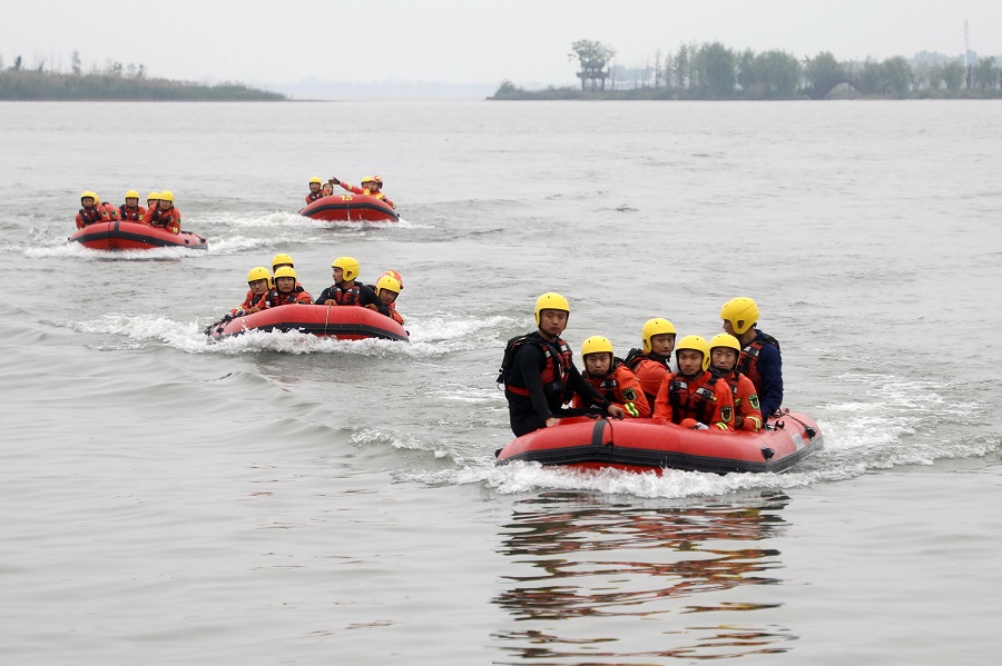 4月21日,消防指战员在柳叶湖进行橡皮艇操作训练。当天,常德市消防救援支队针对汛期特点,组建抗洪抢险突击队,开展水上救人、橡皮艇操作等水上救援大练兵,提高消防指战员防汛救援的能力。陈自德 摄