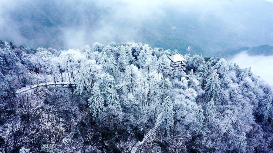 12月14日,浏阳市大围山国家森林公园樱花谷景点,雪花将丛林染白,造型各异的雾凇和雪景交相辉映,宛若仙境。当天,该市迎来入冬以来的首场雪。 彭红霞 摄
